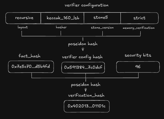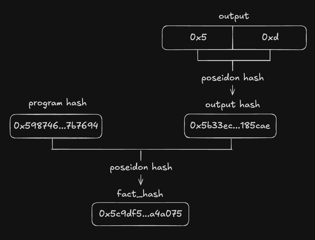 After verifying the proof, Integrity calculates two hashes:program_hash and output_hash. They are Poseidon hashes of corresponding memory sections. Then, those two hashes are hashed together to get fact_hash.