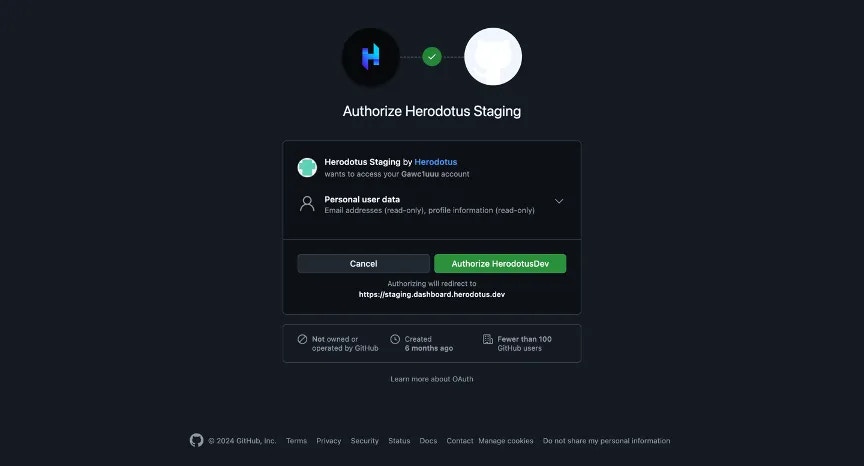 - Select ‘Sign In with GitHub’ and Authorize ‘HerodotusDev’